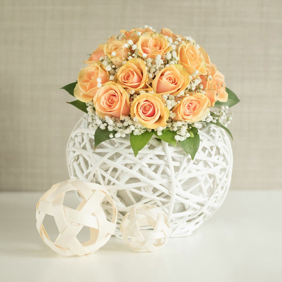 Experience the exquisite beauty of our stunning bouquet, meticulously crafted with vibrant orange roses and airy gypsophila. This unique arrangement is perfect for adding a touch of elegance to your wedding celebration.