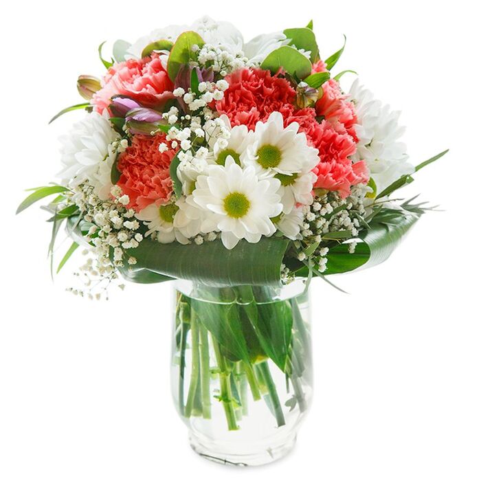 With exuberant freshness, this bouquet is a portrait of joy, set in a crisp white gift bag ready to brighten a doorstep along the peaceful avenues of Chislehurst. Plump coral and peach carnations spill gracefully upward, their ruffled petals soft to the eye and invitingly tactile. White daisies, their sunny green-gold centres sparkling against the petals, weave a note of playfulness that conjures afternoons in nearby parks. Here and there, delicate baby's breath floats like tiny puffs of springtime cloud, adding a gentle innocence that softens the arrangement. A blush of purple-tinged buds, just emerging on the left, adds a whisper of coming delight and keeps the ensemble lively. The whole bouquet is cradled by lush, glossy leaves, each one framing the blossoms as if loving arms encircle a cherished gift. The careful arrangement glows in the soft, even light, speaking to the florist's attention and the bouquet's lasting freshness. Designed for easy delivery and maximum delight, it's the sort of gift that brings a genuine smile, whether for a birthday, new arrival, or simply a thoughtful gesture from the heart of Chislehurst. A lush tribute to Chislehurst's blooming seasons, this bouquet combines crisp white daisies with bold coral-pink carnations, bathed in gentle light against a clean white background. The arrangement, lovingly crafted by a local florist, unfolds in a balanced, circular shape-each daisy's snowy petals contrasting bright green centers, while the carnations ripple with warm, inviting tones reminiscent of sunset at Chislehurst Recreation Ground. Wispy baby's breath scatters among the flowers like tiny stars, bringing airiness and subtle volume. Slender eucalyptus leaves and vibrant greenery evoke the fresh, earthy scent of a walk along Hawkwood Lane after rain. Subtle alstroemeria buds, painted with blush and purple, promise ongoing beauty. The bouquet's joyful character makes it perfect for brightening someone's day, celebrating a special occasion, or conveying love and appreciation with a personal touch-delivered fresh from Chislehurst Flowers to homes and workplaces throughout the community. This cheerful, lively bouquet celebrates the welcoming spirit of Chislehurst, infused with the freshness and optimism of a spring morning. Ruffled coral-pink carnations stand at the heart, their vibrant hues and textured petals reminiscent of the garden borders along Elmstead Lane. Around them, crisp white daisies shine like tiny morning suns, each with a vivid green center exuding playful innocence and optimism. Soft, cloud-like sprays of baby's breath weave in and out, choosing the spaces in between blooms to offer subtle, airy contrast. A few tightly closed magenta alstroemeria buds rest along the edge, hinting at new beginnings-perhaps mirroring the excitement of moving into a new home near Chislehurst High Street. Broad, glossy green leaves form a grounding, graceful collar beneath the blossoms, providing structure while slender leaves reach skyward for balance and movement. The entire creation rests in a simple glass vase, where sturdy stems are clearly visible through clear, fresh water. Bathed in gentle, even lighting and framed by a pristine white background, every color and texture is allowed to shine, making this bouquet a thoughtful gift for celebrations, thank-yous, or simply sharing joy around Chislehurst.